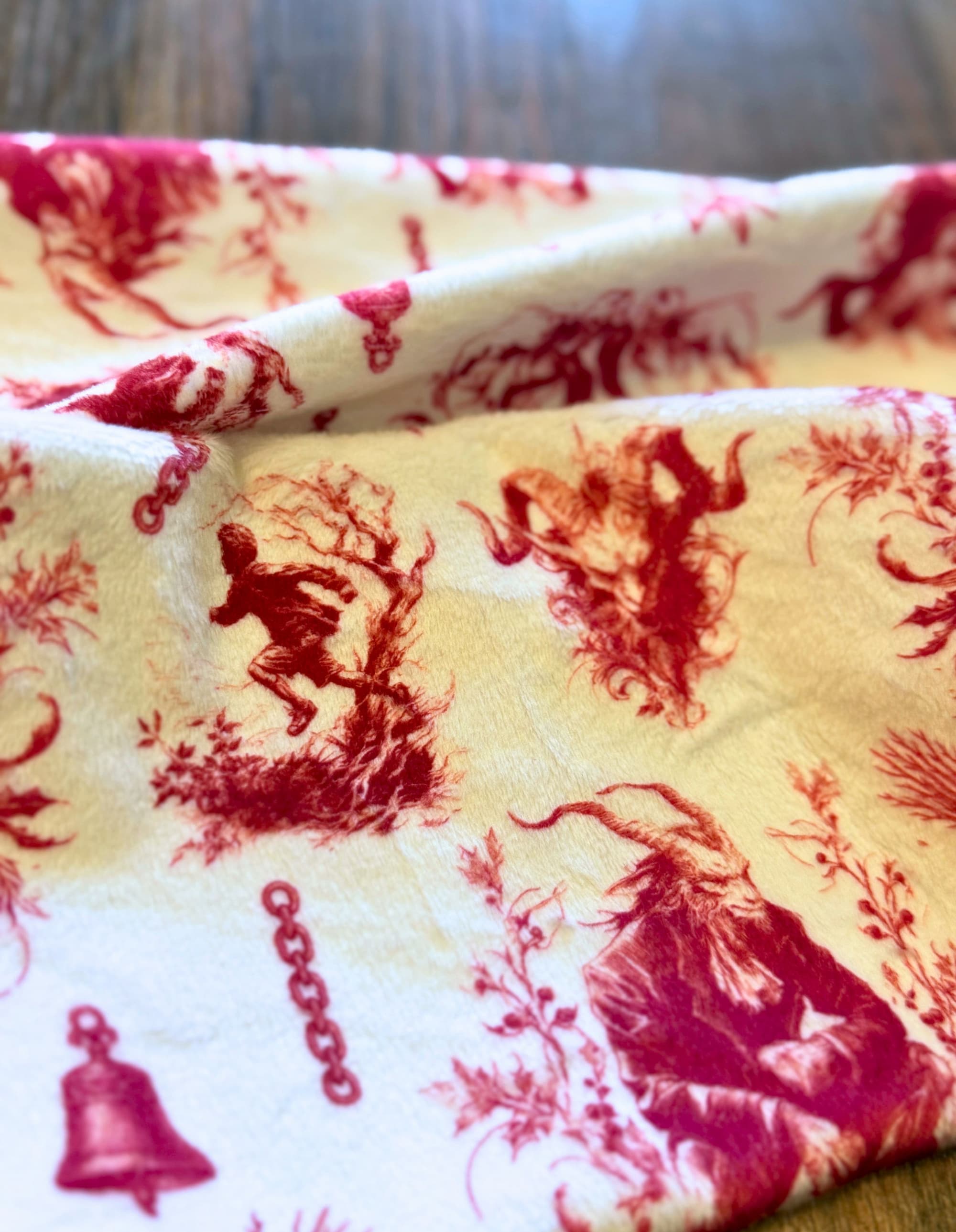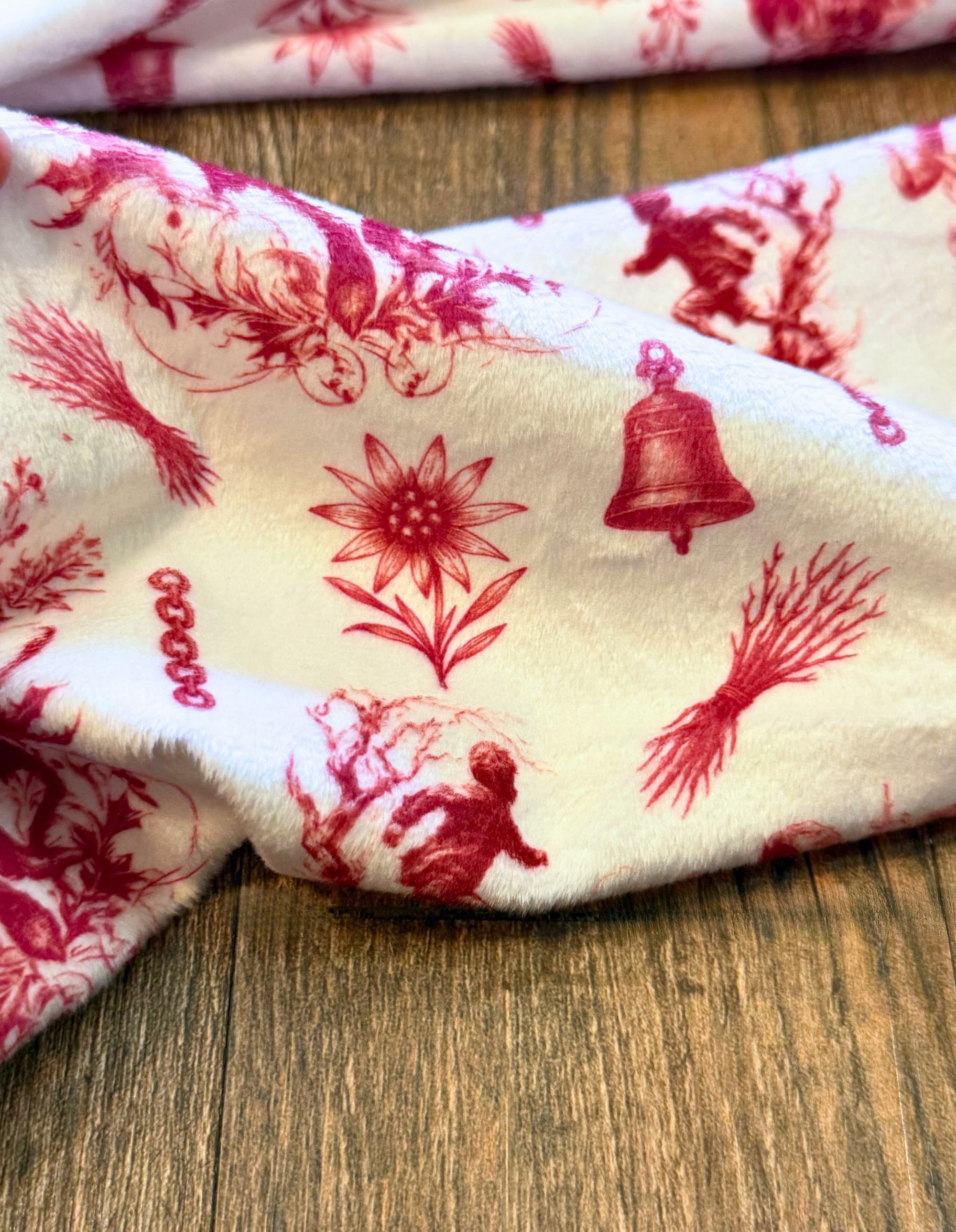 - Custom printed fabric featuring intricate red toile-style print features Krampus in all his festive fury + his devilish grin and bundled switches to the edelweiss, bells, and chains that echo Alpine folklore.