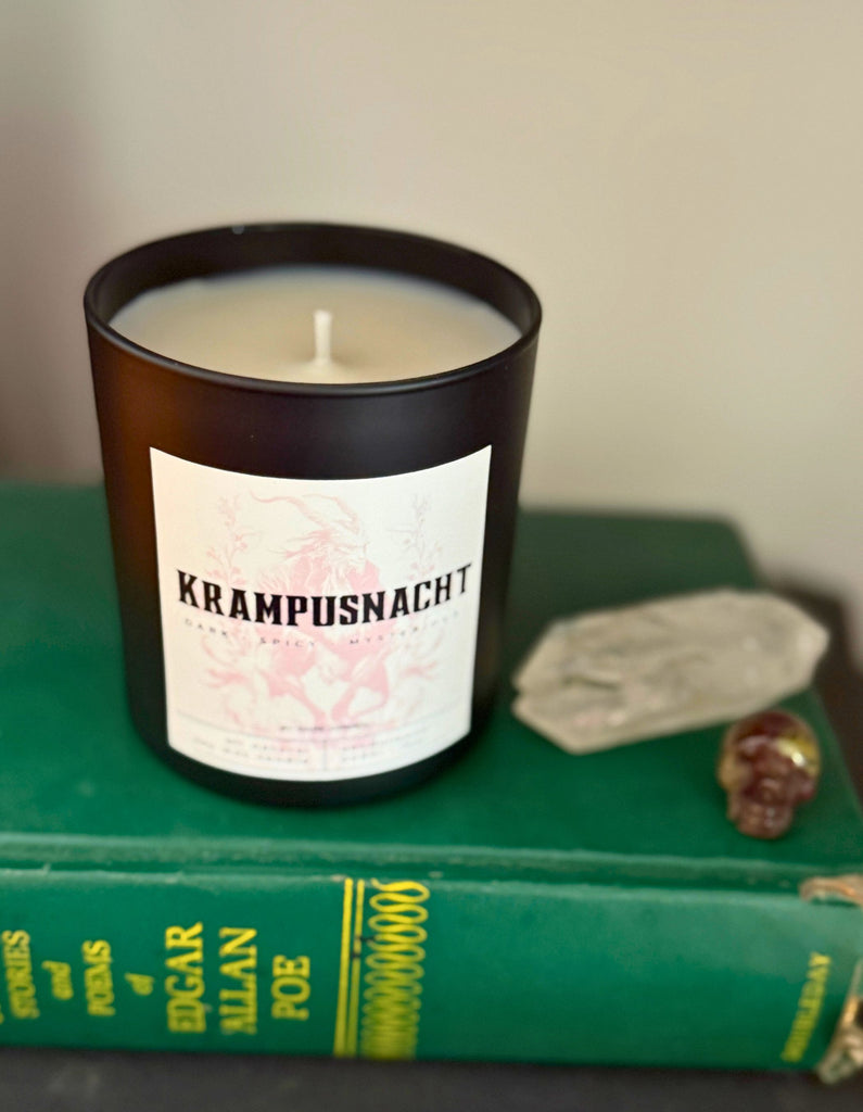The Krampusnacht candle is for those who prefer their holiday traditions a little less sweet and a little more sinister. Inspired by the infamous Alpine legend, this blend of sandalwood, cedar, and amber has a warm, smoky vibe that feels like a cozy night by the fire… if that fire was in the depths of the Black Forest.