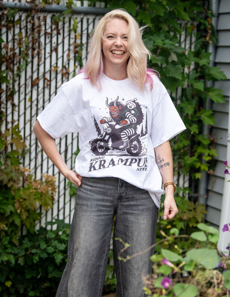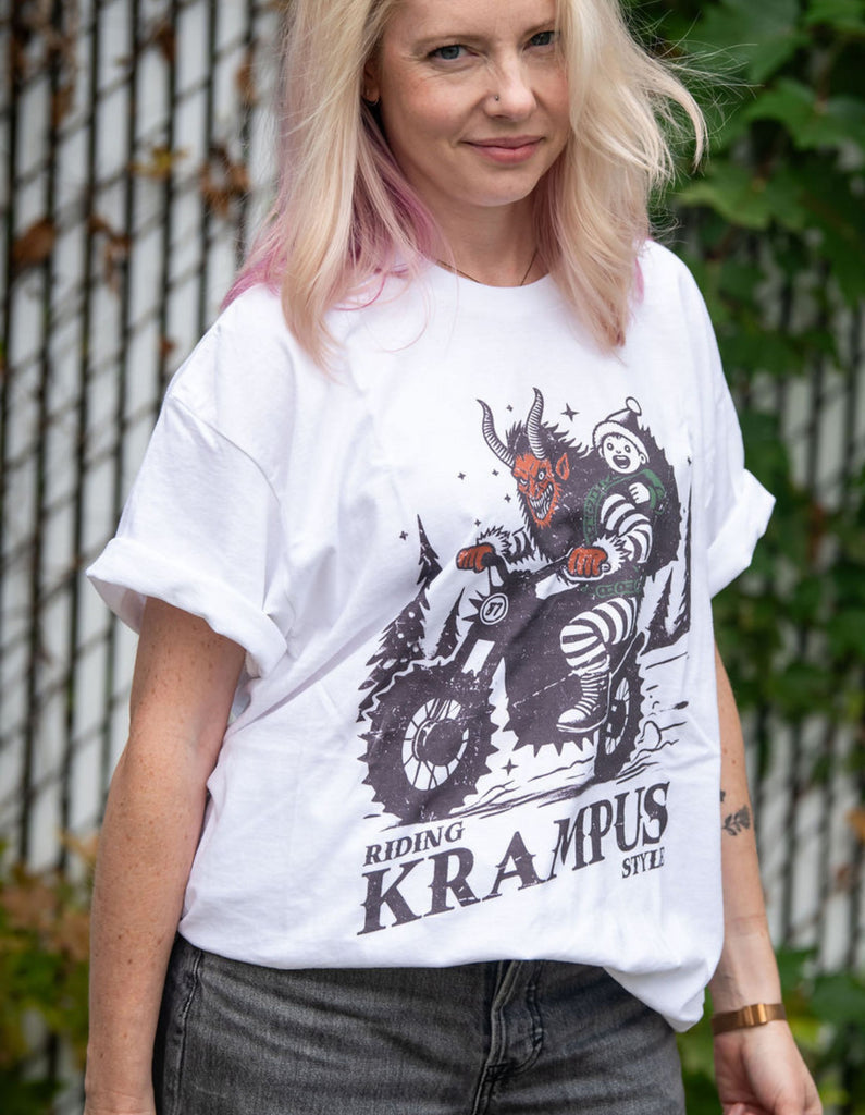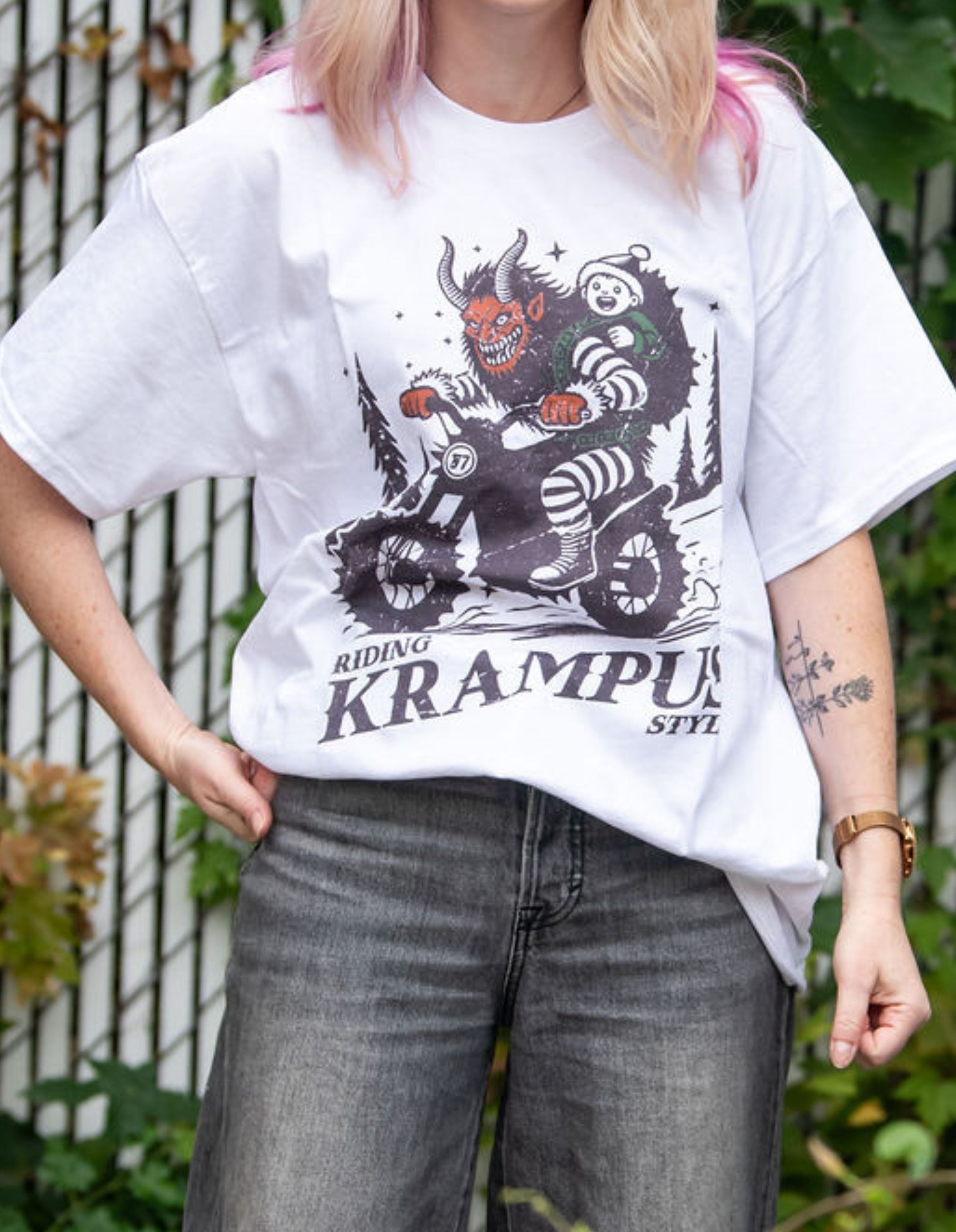 Santa’s sleigh? Too basic. This tee features Krampus tearing through the forest on a motorcycle with a sack full of naughty kids in tow. Printed in vintage-inspired red and black on a crisp white shirt, the Rebel Krampus Tee is equal parts rebellious and festive. Perfect for Krampusnacht, Christmas parties, or anyone who’d rather ride with Krampus than sip cocoa with Santa.