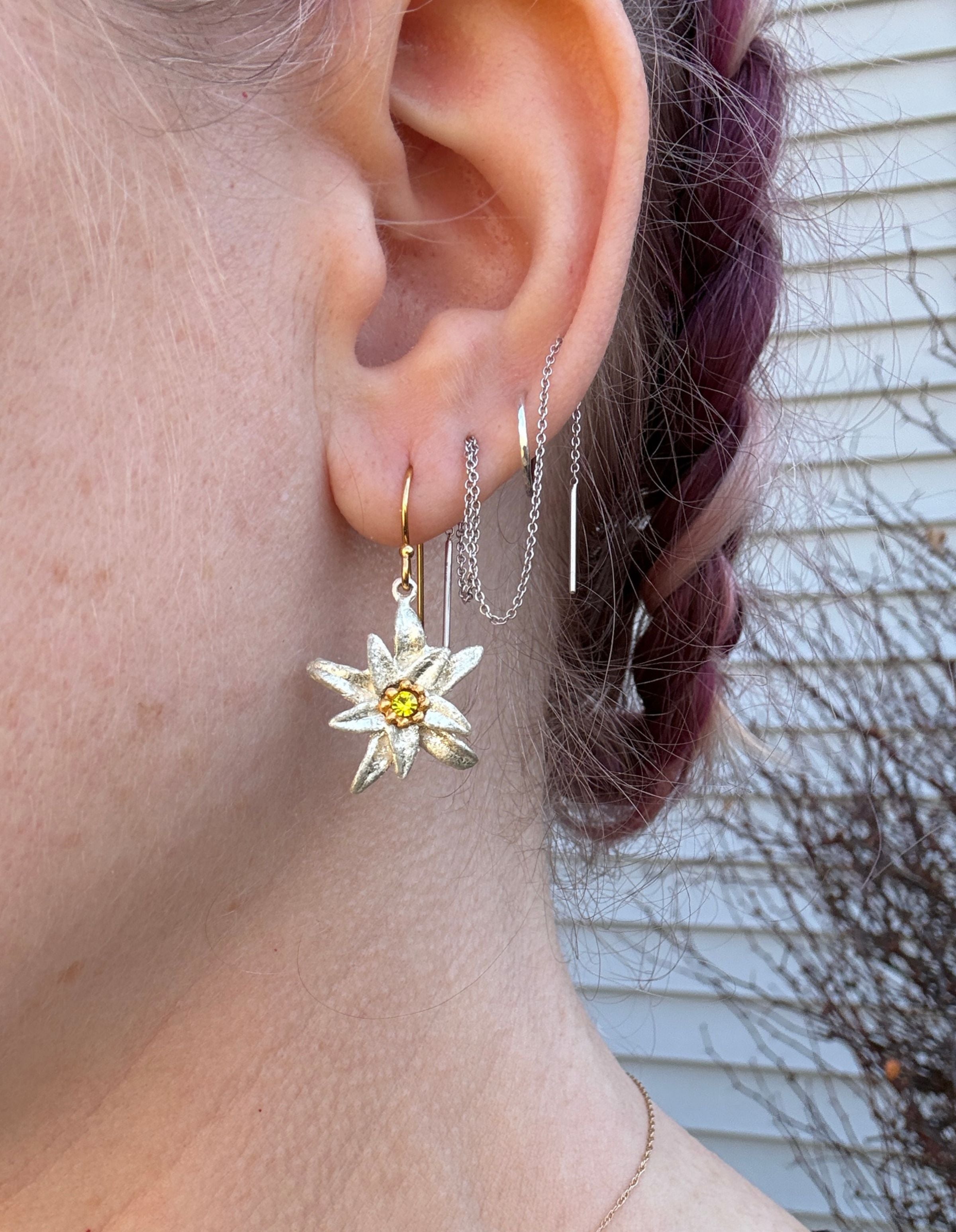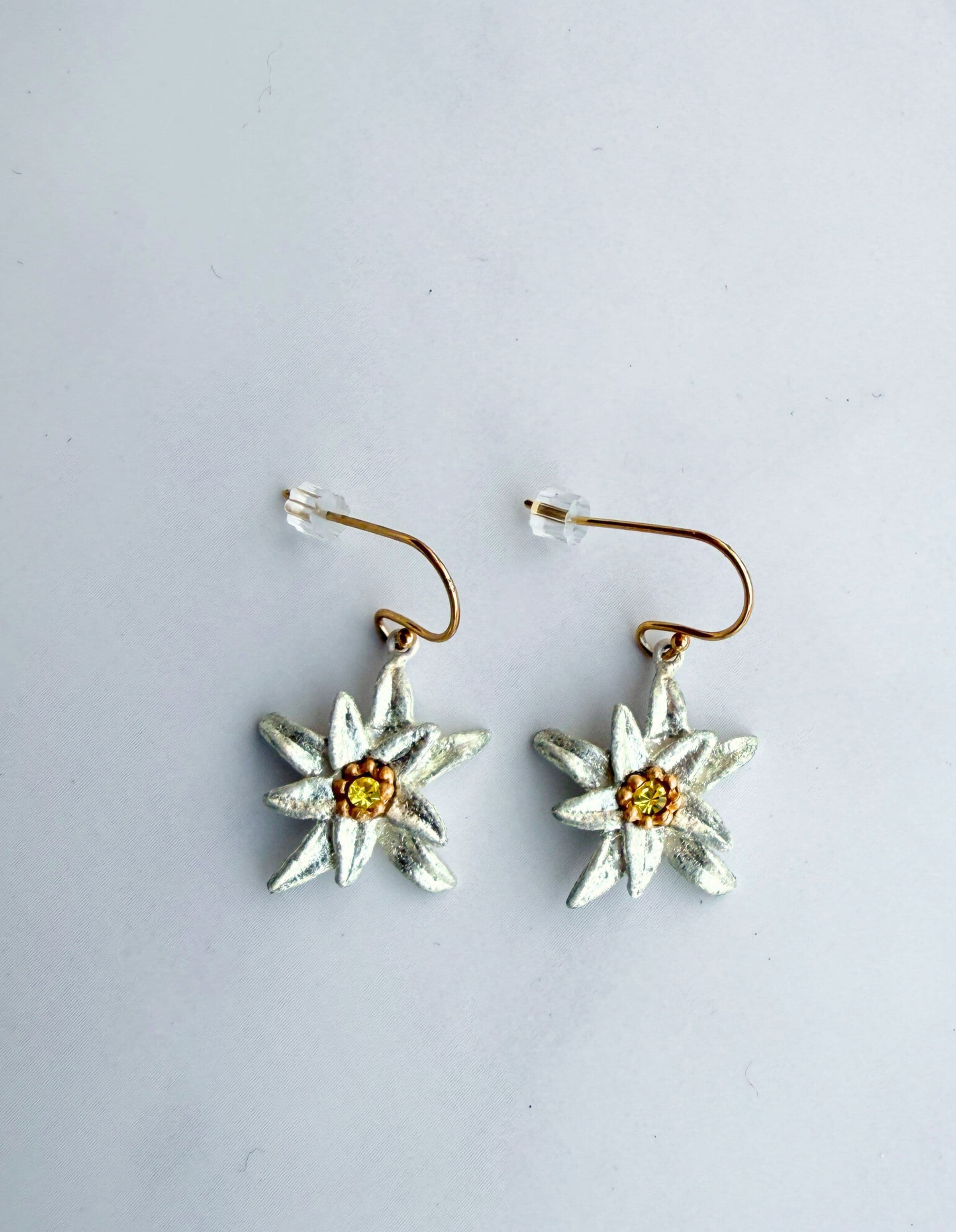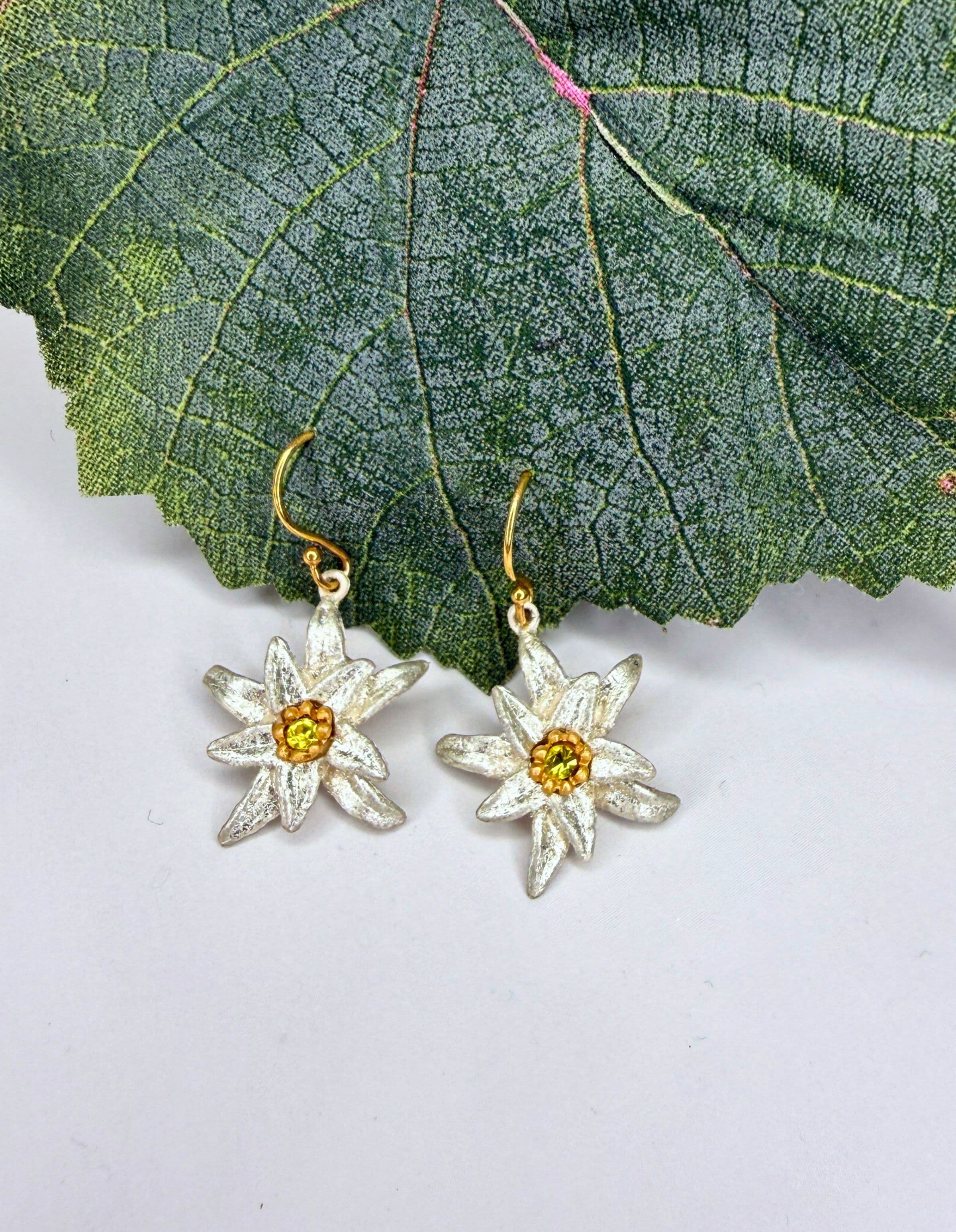 Inspired by the Edelweiss, a rare alpine flower that symbolizes courage and devotion, these handcrafted Edelweiss earrings capture the delicate beauty of the mountains in remarkable detail. Each piece is cast from real botanical forms and finished by hand, creating a small work of art that feels both timeless and deeply connected to nature.