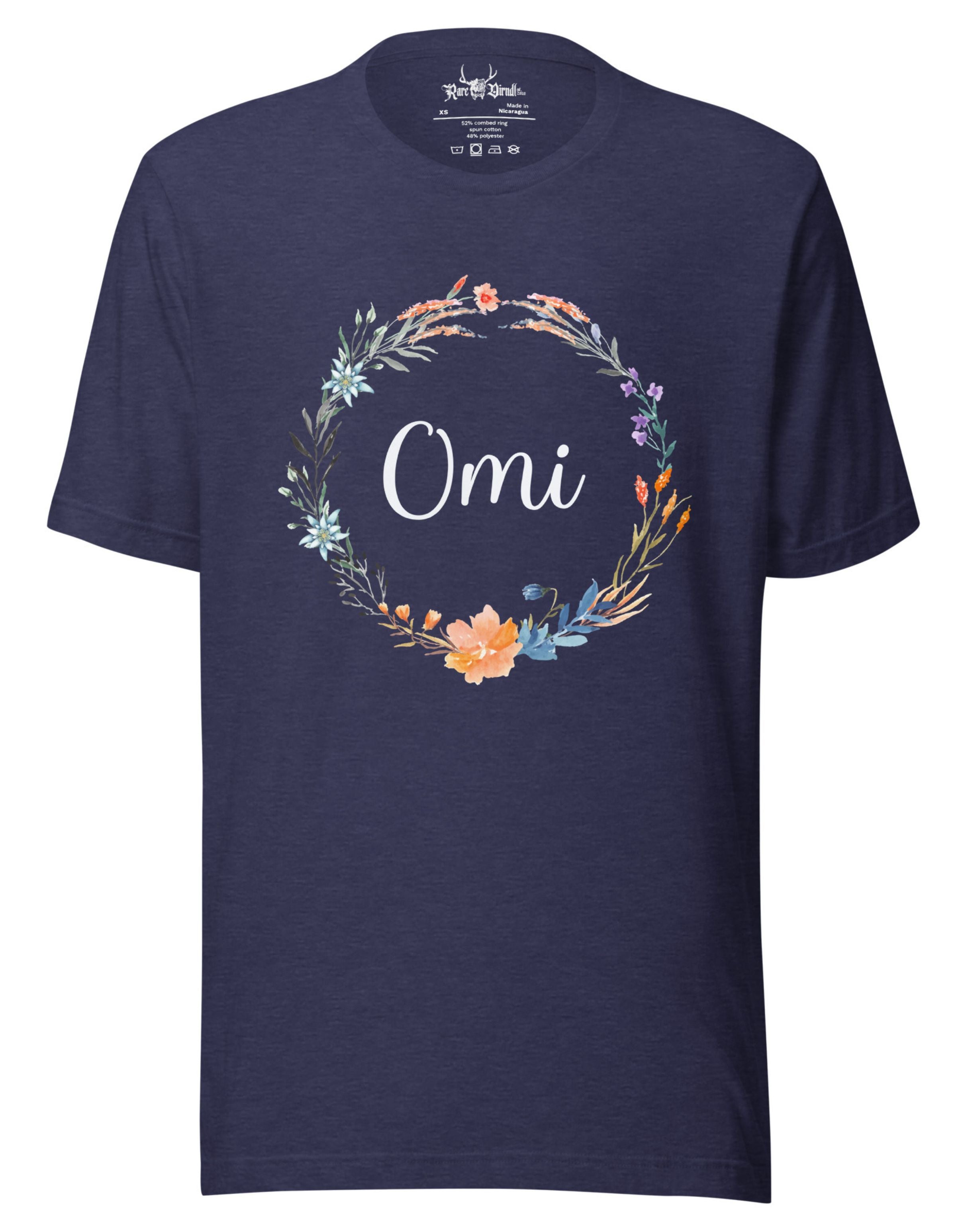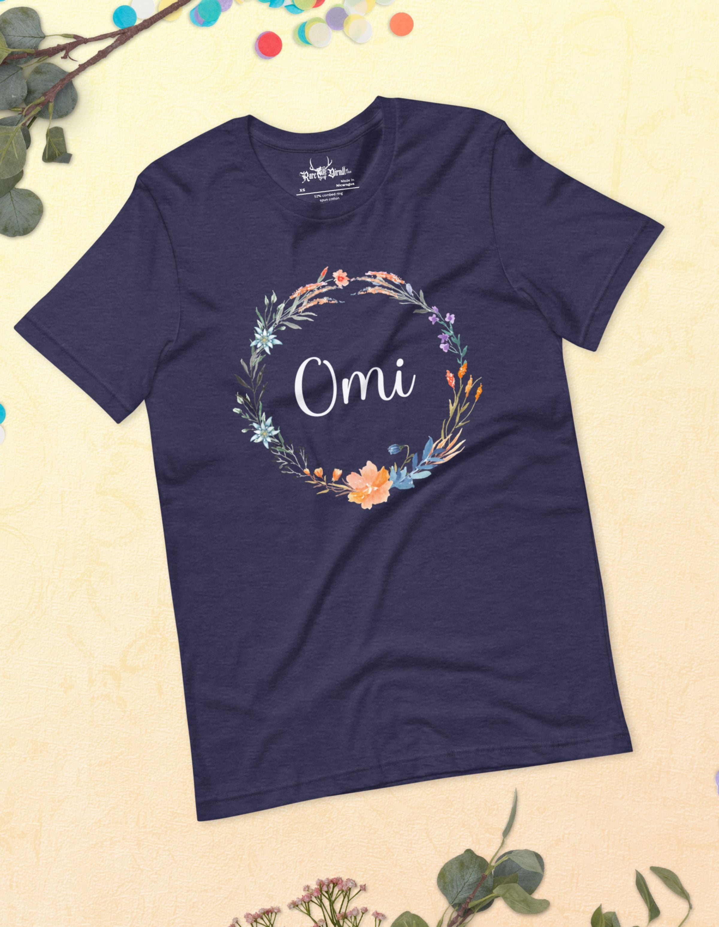 Adorning the shirt is a delicate ring of flowers, including the iconic Edelweiss, a symbol of purity and enduring love. Nestled in the heart of this floral embrace is the word "Omi," a tribute to the nurturing spirit and boundless affection that grandmothers bring to our lives.