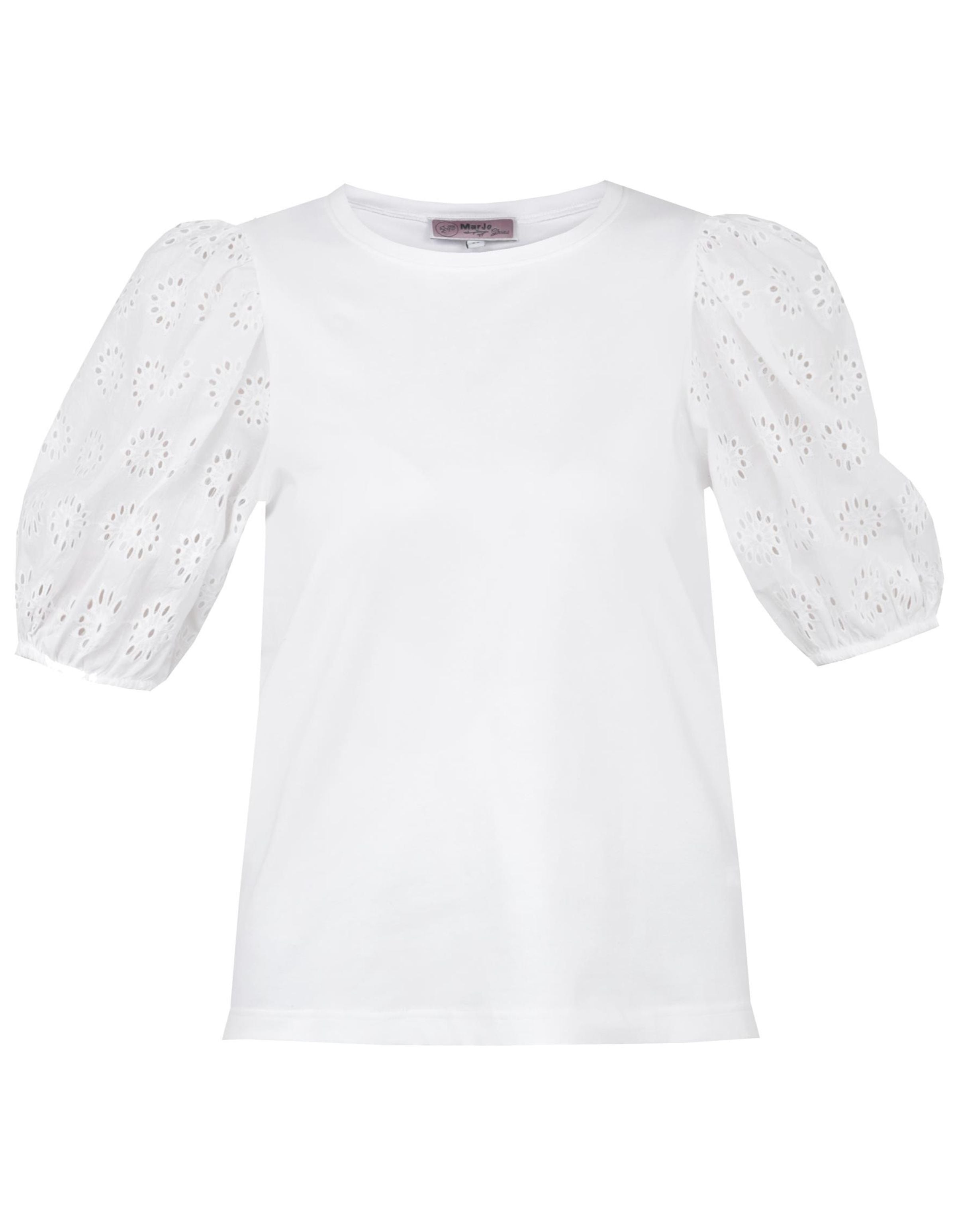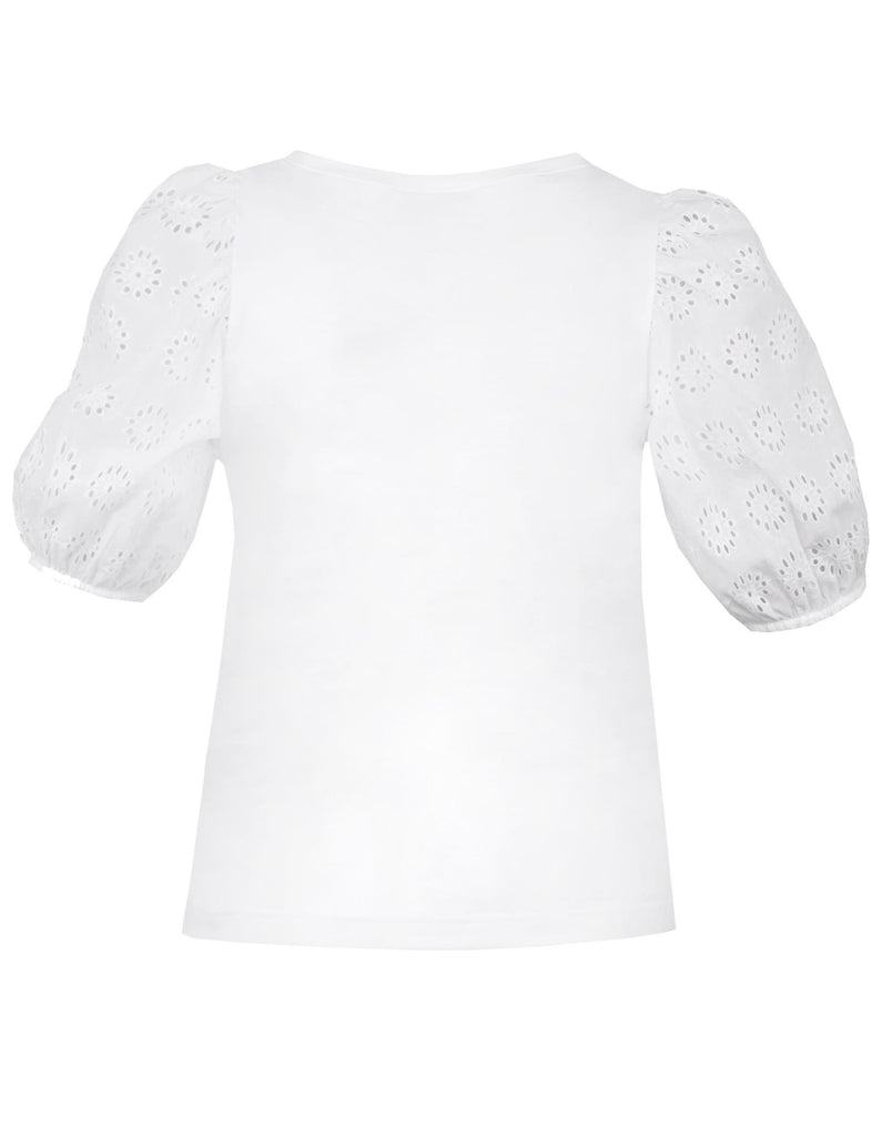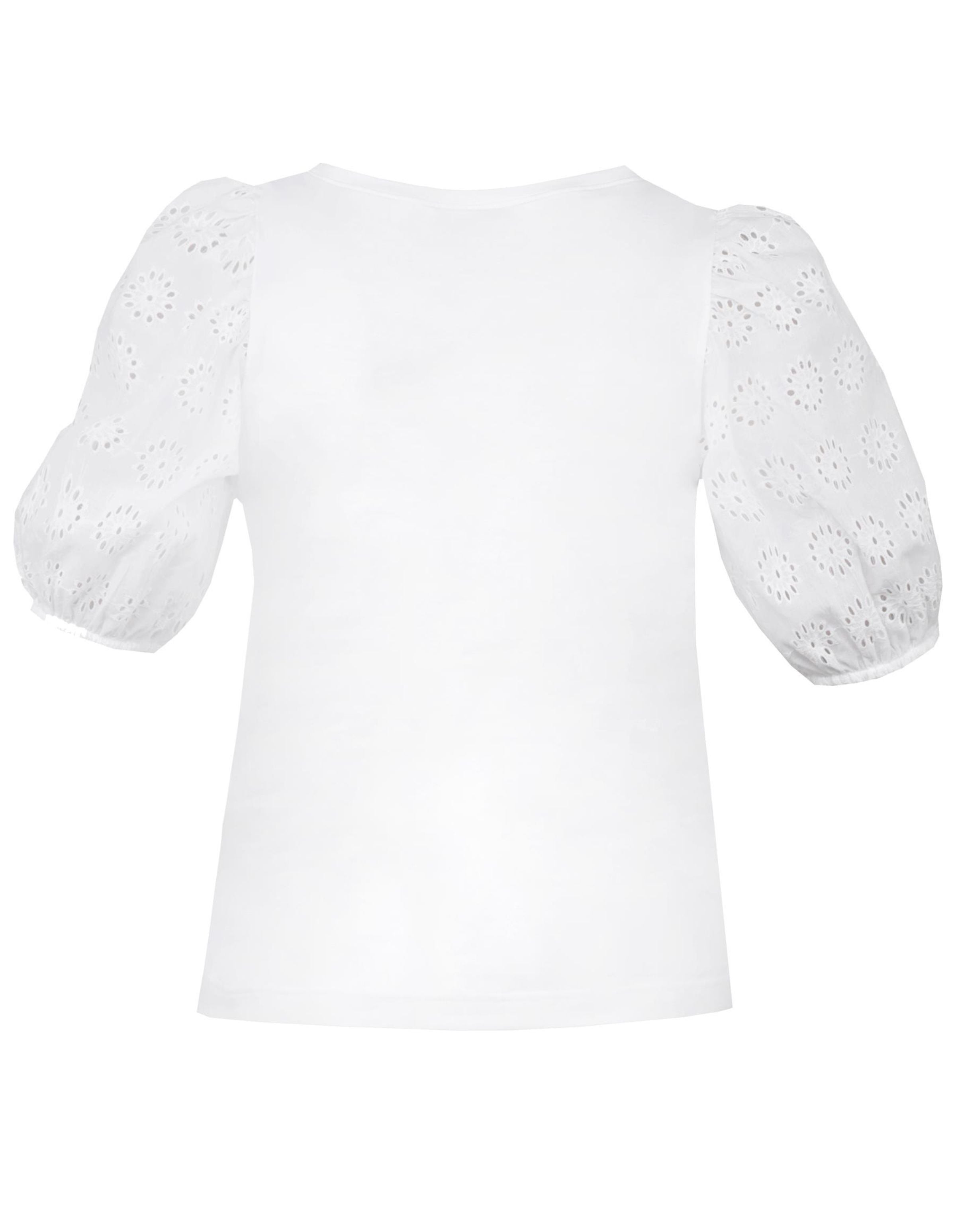 - Puff sleeves made from crisp white cotton eyelet with floral cutwork design