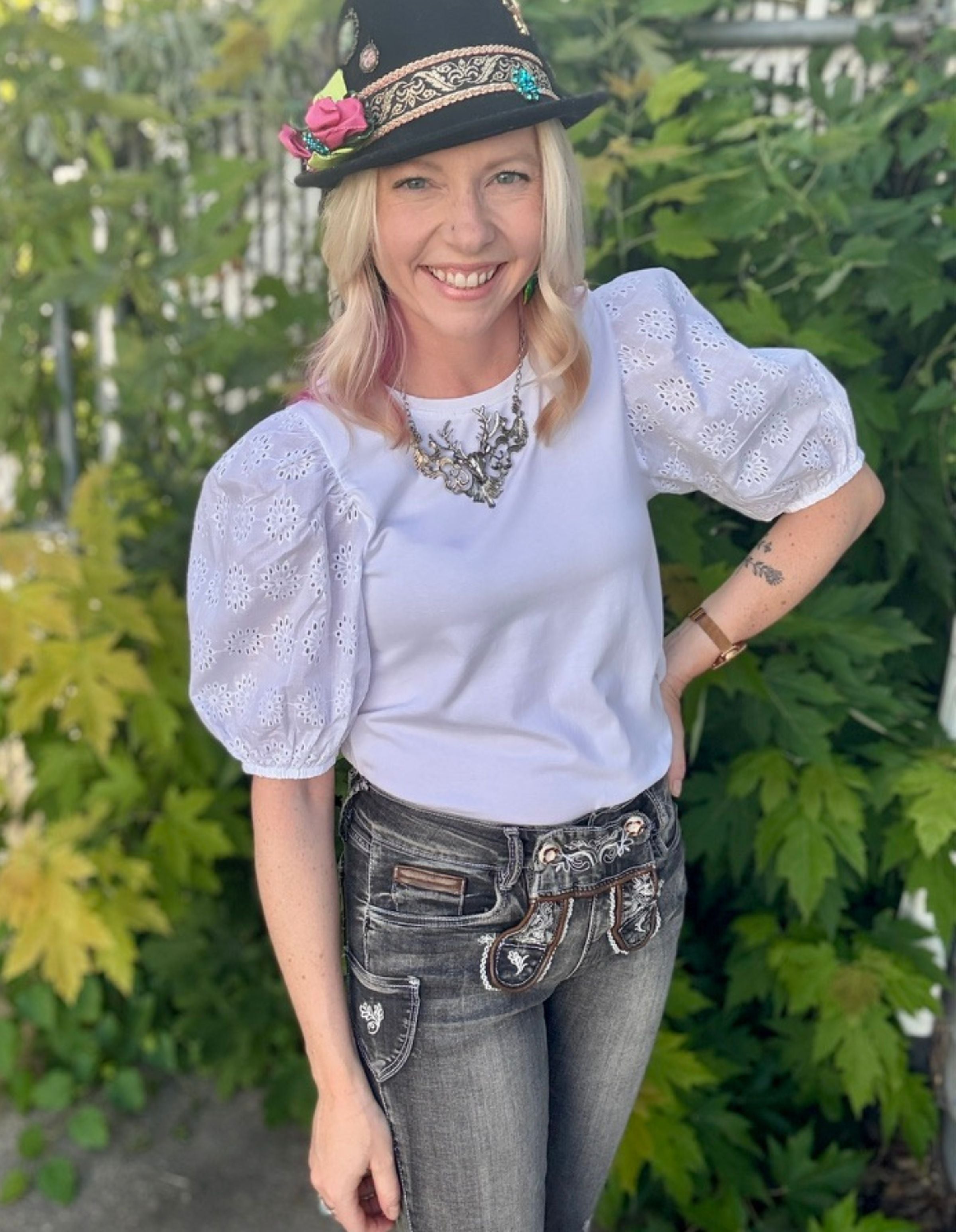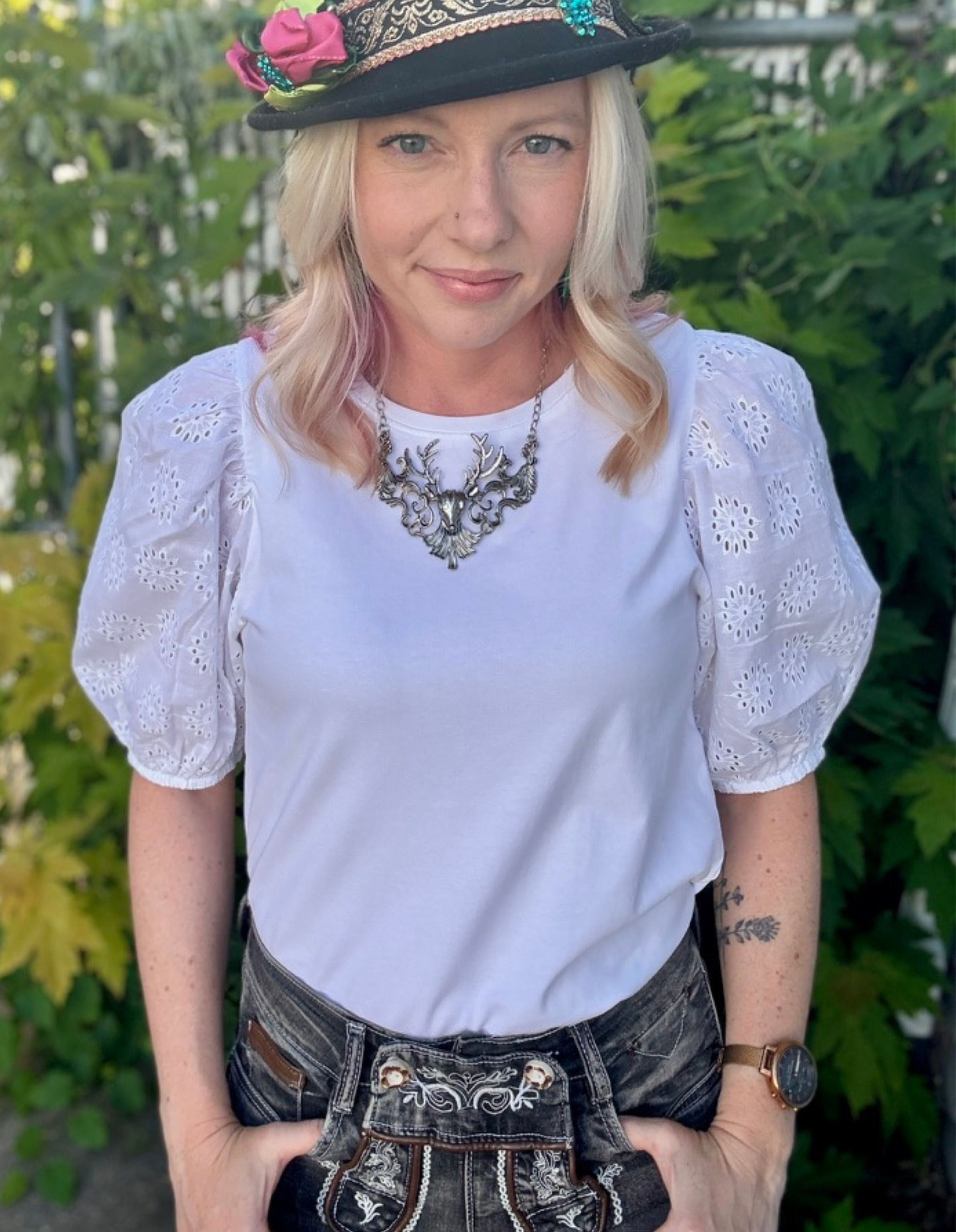 Looking for a comfortable, everyday blouse that still brings a touch of dirndl flair? This full-length blouse is the best of both worlds. Made with a soft knit body that feels like your favorite t-shirt and finished with crisp cotton eyelet puff sleeves, it’s a perfect blend of casual and traditional. Whether you're pairing it with a dirndl skirt or your favorite pair of lederhosen jeans, this top brings effortless style and all-day comfort.