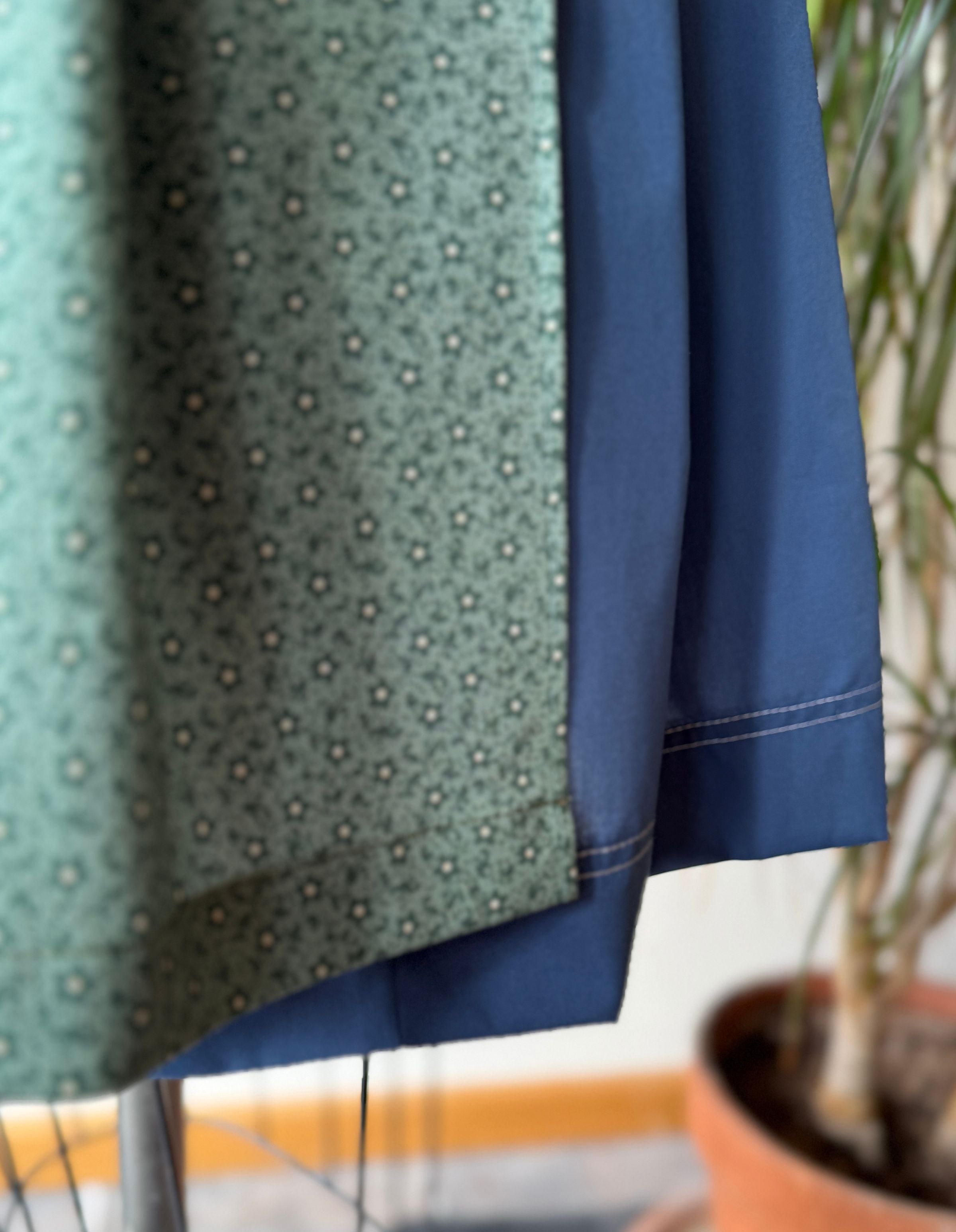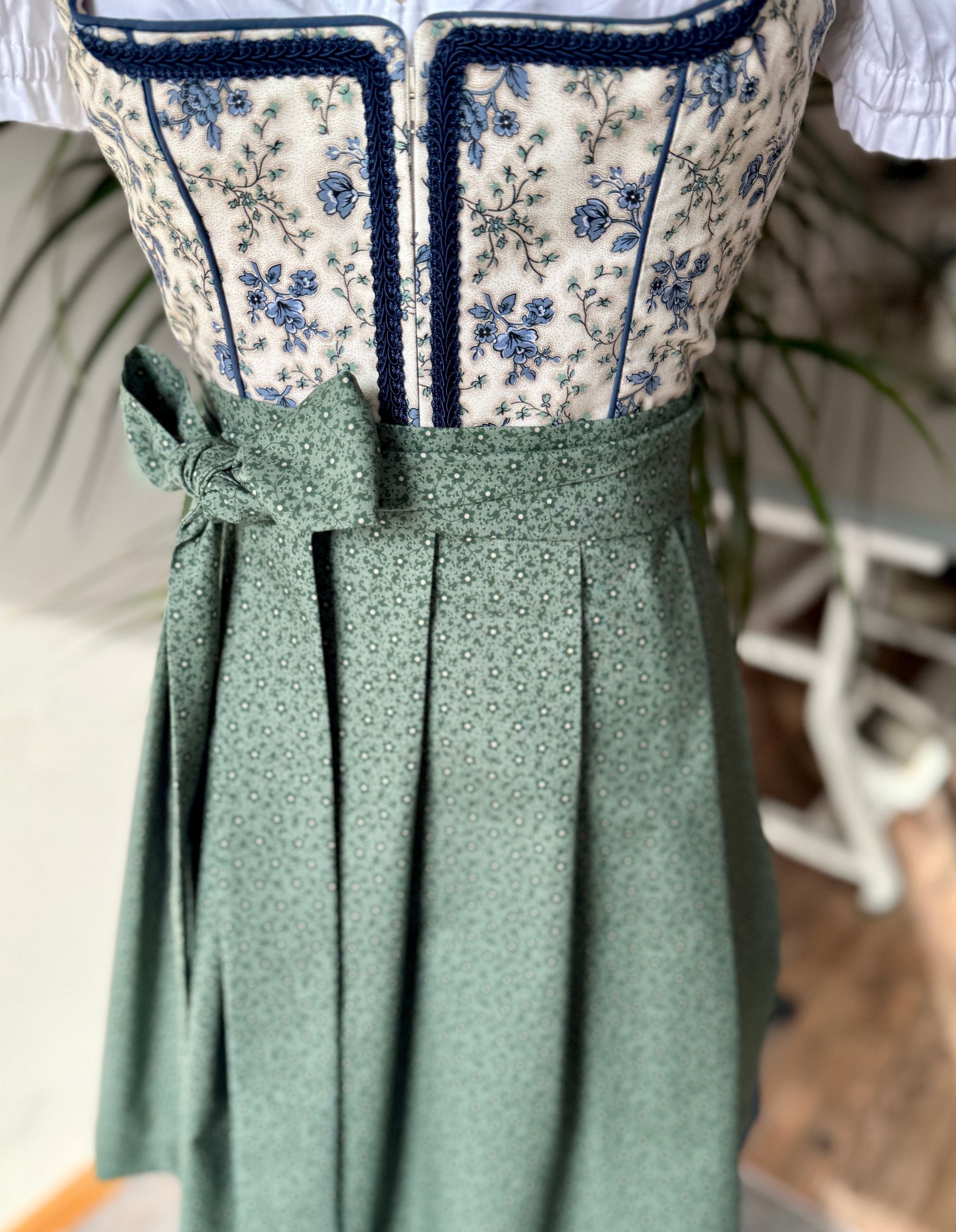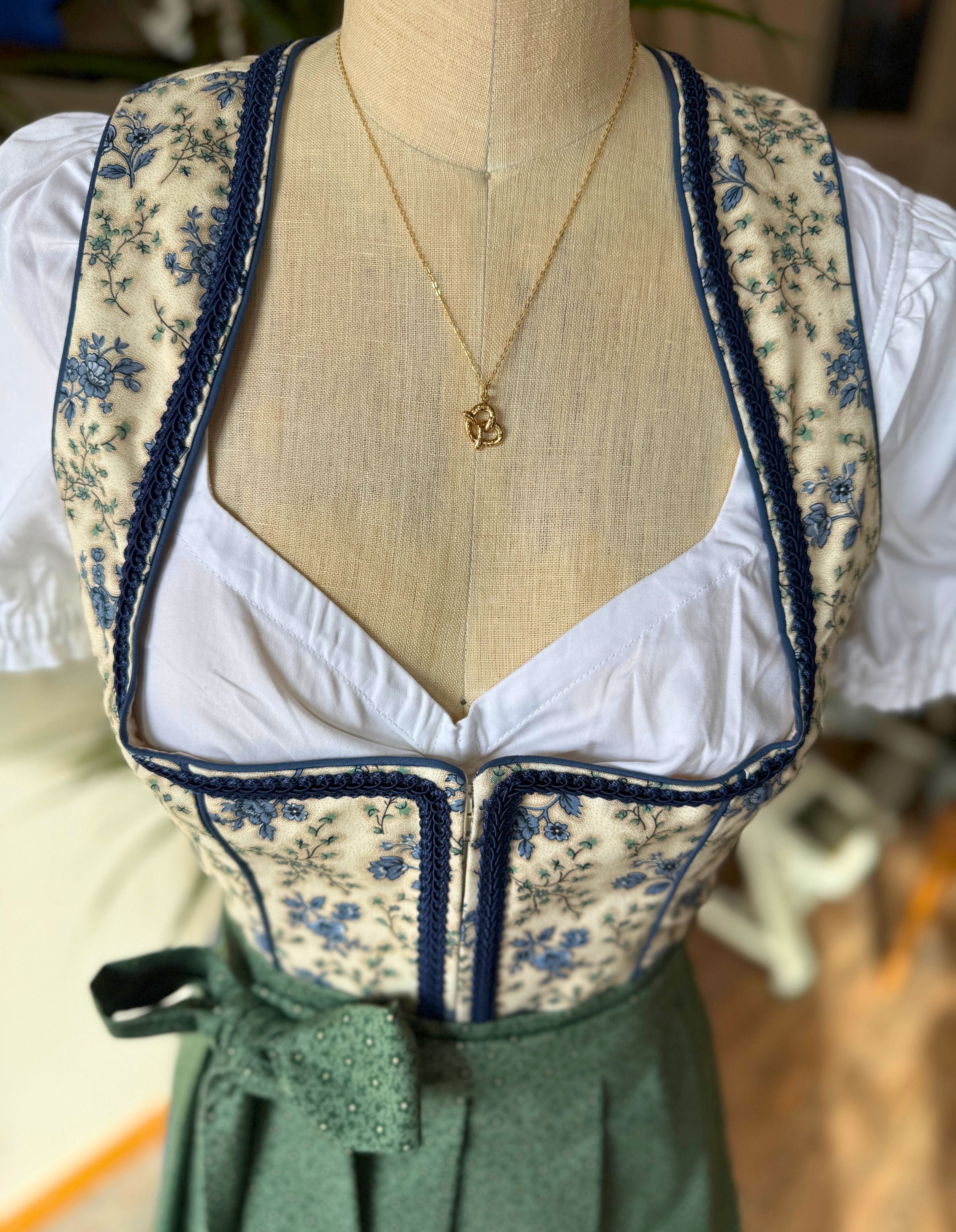 The Indigo Meadow Dirndl is a modern floral dirndl for women who want authentic Bavarian style without looking costume-y. This knee-length dirndl features a delicate blue, green, and ivory floral bodice trimmed in navy for a crisp, structured finish. The square neckline is framed with braided trim and cotton piping along the armholes and princess seams, creating a flattering, tailored silhouette. A reinforced center front zipper keeps the fit clean and supportive.