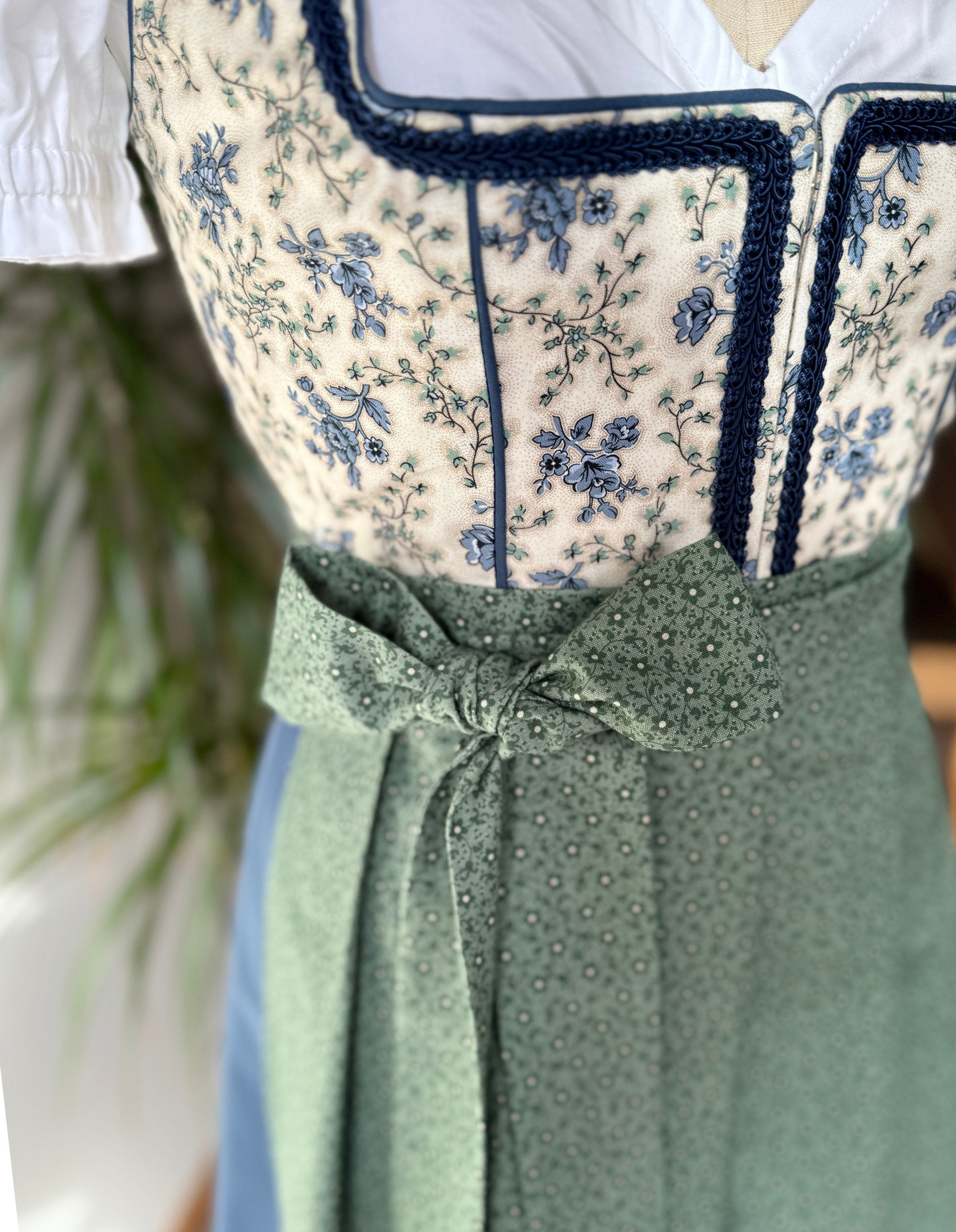 A fresh, knee-length dirndl in delicate shades of blue, green, and ivory that feels like summer in the Alps. The navy trim sharpens it up, the green apron keeps it playful, and the whole thing sits perfectly between traditional and modern.