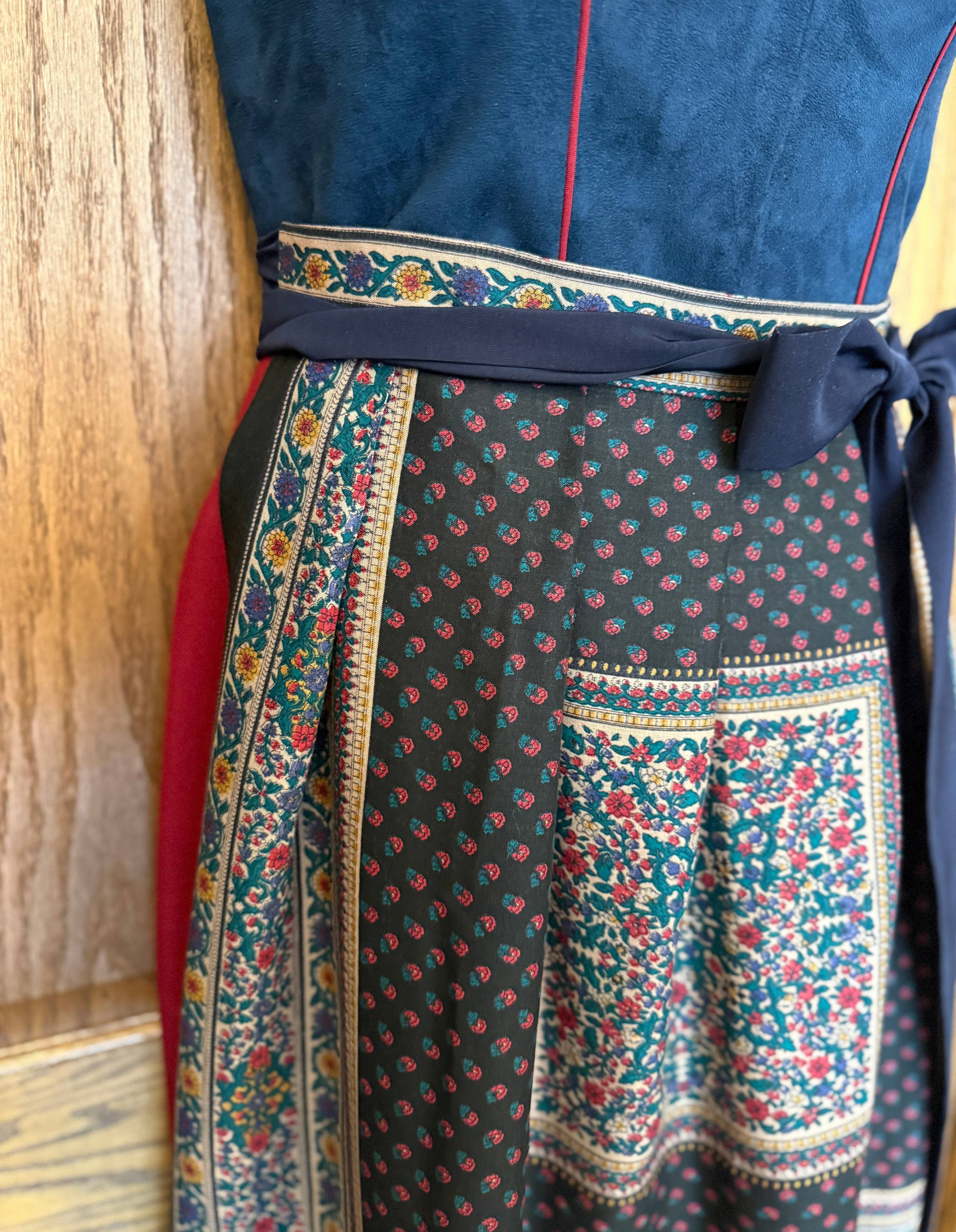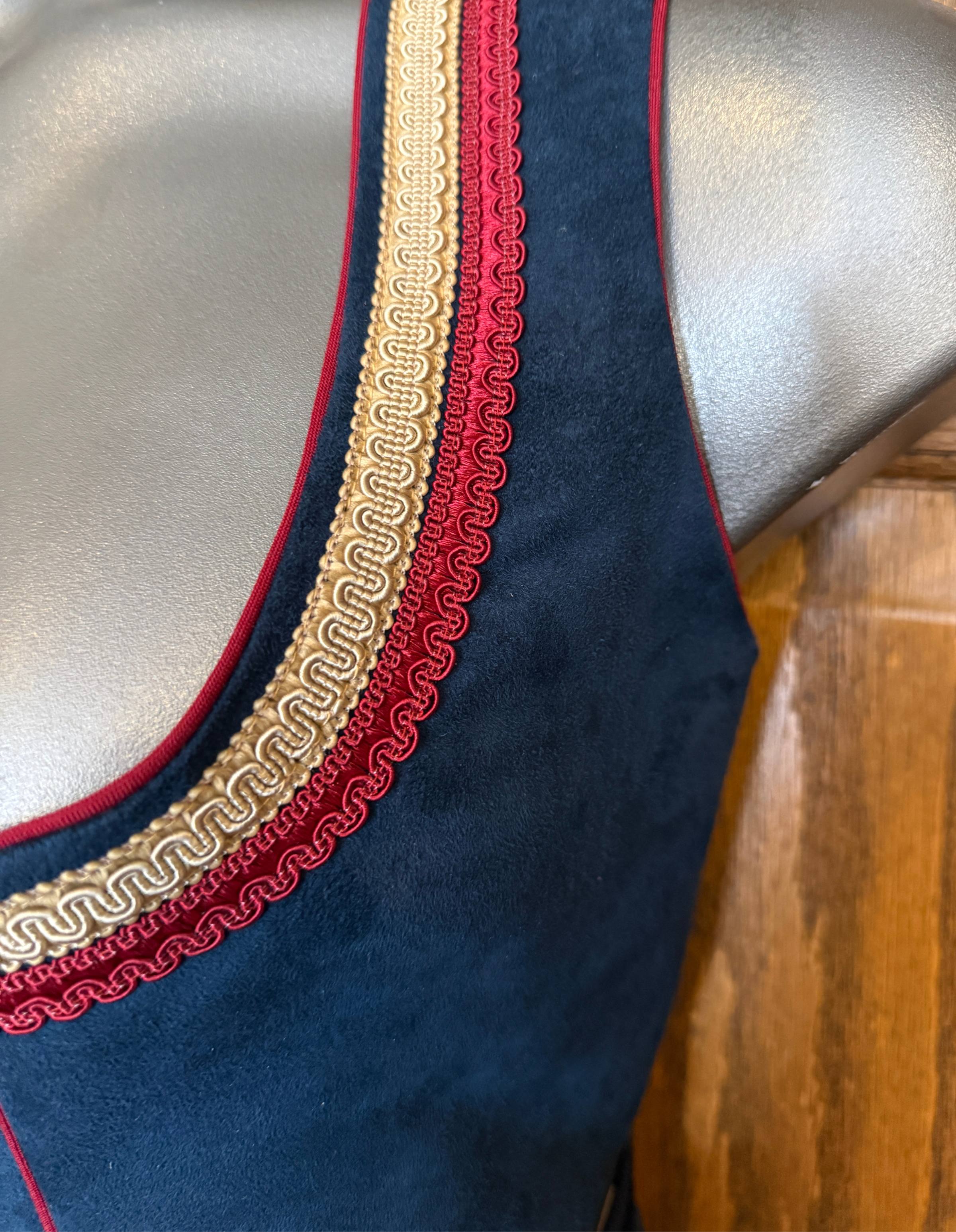 - Navy faux suede bodice with gold and burgundy braided trim around the classic square neckline.